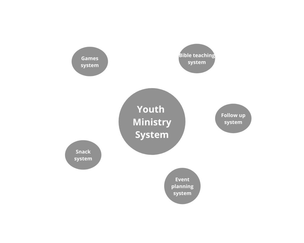 The first step in building systems is making them visible. You need to get a picture of the WHOLE Ministry. I like to do this through making a “bubble chart.” Here’s an example of my Youth Ministry system: