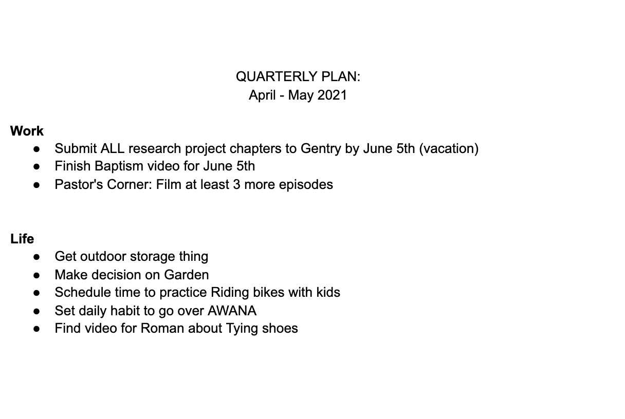 You don’t need a lot of sophisticated tools for Quarterly Plans. A piece of paper and a pen or a Word Doc will do. Sometimes having a white board to brainstorm ideas is helpful as well. The point of the Quarterly Plan is to think about how to make progress on important projects. Here’s an example of my Quarterly Plan: